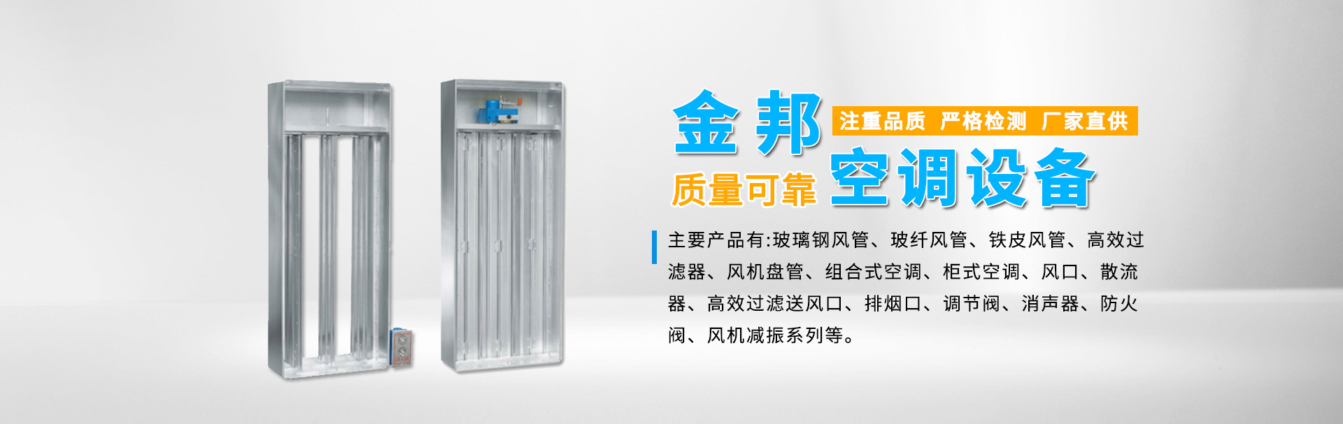 江蘇金邦空調設備制造有限公司專業(yè)生產(chǎn)玻璃鋼風管、玻纖風管、鐵皮風管、高效過濾器、風機盤管、組合式空調、柜式空調、風口、散流器、高效過濾送風口、排煙口、調節(jié)閥、消聲器、防火閥、風機減振系列等產(chǎn)品